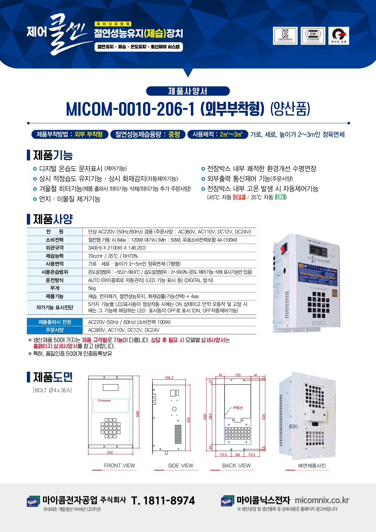- 전기전자제어기기 및 수배전반 특고압 전장박스내부의 결로현상과 수증기를 방치시 습도가 상승하여 절연이 불량해지는 위험이 있다. 마이콤전자공업의 오랜 기술력을 바탕으로 개발한 제어쿨센절연성능유지장치(제어쿨센제습기)는 기존 SPACE HEATER 제품들이 주로 사용하던 습기가열 방식 대신 펠티반도체 냉각 방식으로 습기를 급속히 냉각하여 외부로 배출하는 마이콤제어기술을 적용하여 신속한 습기제거로 절연성능 극대화를 달성하였다.
