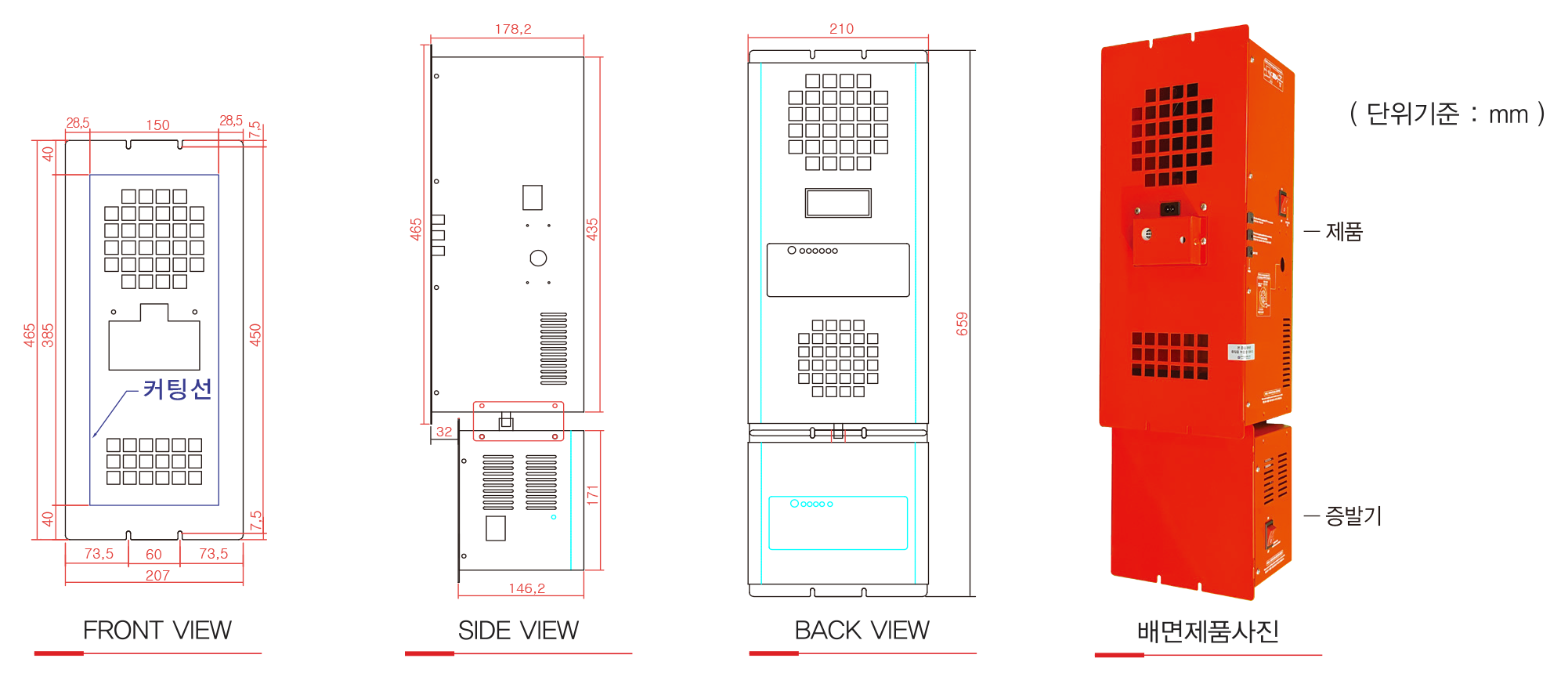 • 전장박스 외부에 장착하여 제습기능, 먼지제거기능, 절연성능유지기능, 온도 하강기능, 증발기재어기능을 하면서 적정습도 45%를 자동관리하며 디지털 온습도계가 실시간으로 자동제어 관리한다.